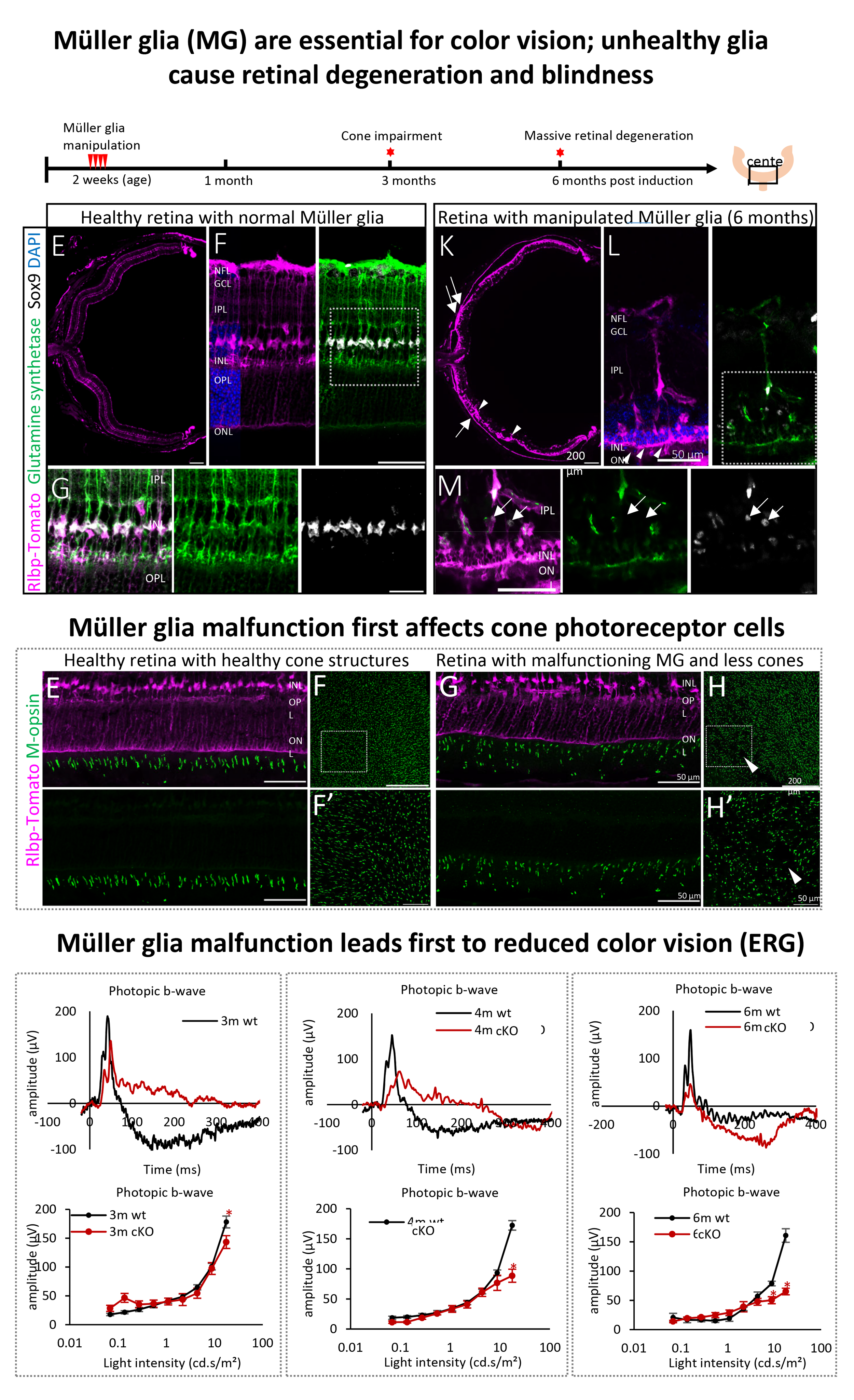 Our lab investigates retinal glia in the healthy and diseased retina and wants to understand their role during disease progression. Our focus lies on Müller glia, the major glial cell type in the retina. We are interested in two major questions:
